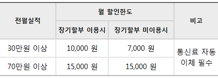 KT 혹은 LGU+를 사용하시는 분들은 서둘러 카드 신청하시고, 자동이체 걸으셔서 통신요금 할인 받으세요.