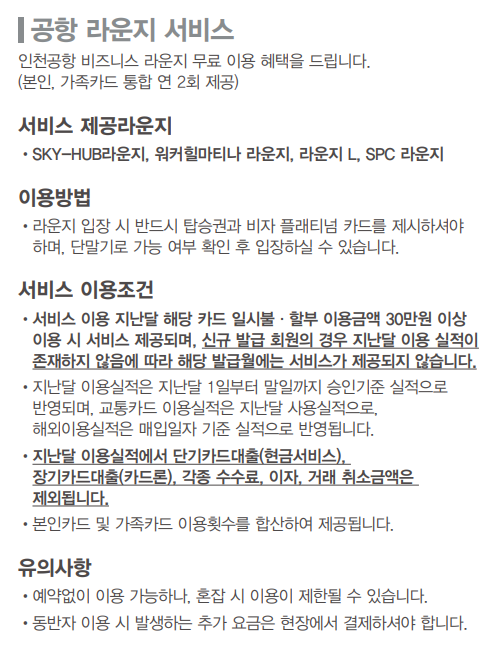 √ 사용 예시 : 해외여행을 가기전 전월 실적 30만원을 채운 후, 다음달 본인의 비자 플래티늄 카드와 가족카드를 지참하고 인천공항 라운지 이용 시 통합 연2회 라운지를 한방에 무료 이용 가능