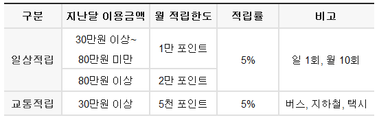 ※ 월간 2만 포인트 한도, 건당 최대 2천 포인트 적립 / 횟수제한 및 최저 금액 제한 없음