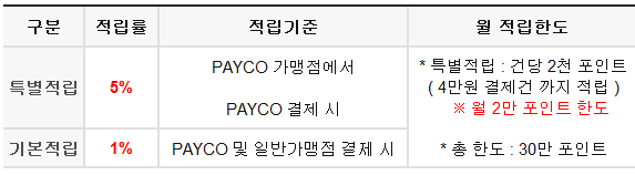 - PAYCO 포인트는 이용내역의 매달 1일~말일 매출표 매입건에 대해 다음 달 27일(휴일인 경우 다음 영업일)에 본인의 PAYCO 계정에 일괄 적립됨