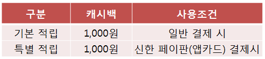 ※ 요약하자면 ① 1만원 이상 사용하고 ② 사용 횟수는 2번 이상이며 ③ 2번 중에서 한번은 꼭 신한 페이판(앱카드)로 결제해야 합니다. 그래야만 일반 적립과 특별 적립까지 2천 포인트를 적립 받을수 있습니다.