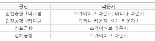 | ※ 공항라운지 이용 조건의 전월 이용금액 제외대상 국세, 지방세, 공과금, 아파트관리비, 대학교등록금, 정부지원금, 상품권 구매, 기프트카드 구매, 선불카드 충전, 신차구매(국산차 및 외제차), 단기카드대출(현금서비스), 장기카드대출(카드론), 연회비, 각종 수수료, 이자, 매출취소금액 |