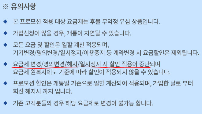 요금제 변경/명의변경/해지/일시정지 시 할인 적용이 중단된다고 나와있네요. 만약 이 요금제를 쓰다가 타 통신사로 번호 이동을 한다고 한다면 반드시 월 초에 진행하는게 좋겠습니다.