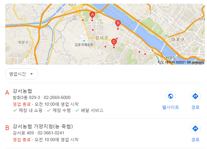 ※ 100% 정확하진 않으나, 중앙회 소속인지 지역/단위 농협인지 구별하는 방법은 "지점" 글자 유무로 판단을 합니다. 아래의 그림에서 처럼 (A)강서농협은 중앙회 소속일 가능성이 크고, 뒤에 지점이 붙은 (B)강서농협 가양지점은 지역/단위 농협일 가능성이 큽니다.