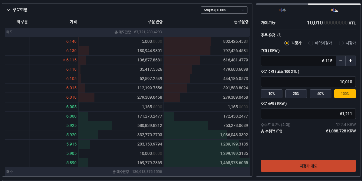 우측 하단에 매도 버튼을 누르면 보유하고 있는 10,010XTL 이 매도 가능 코인으로 뜨네요. 시세가 대략 6원 정도에서 움직이네요.