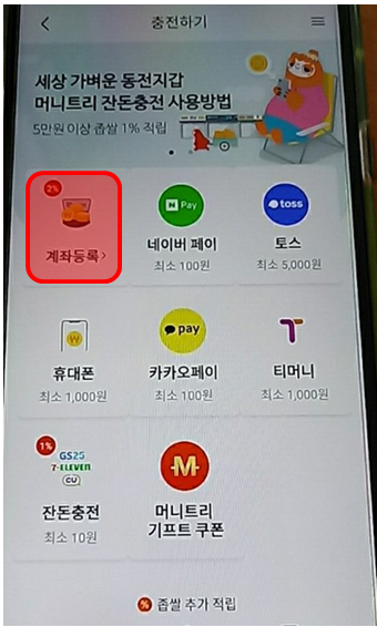 아마도 계좌 등록이 안되어 있을 겁니다. 계좌등록을 먼저 하시구요. 좌측 상단에 2% 라고 보이시면 계좌충전 시, 계좌 충전금액의 2% 에 해당하는 좁쌀머니를 줍니다. 일정 금액 이상을 충전해야지만 좁쌀 머니를 주는 것 같습니다.