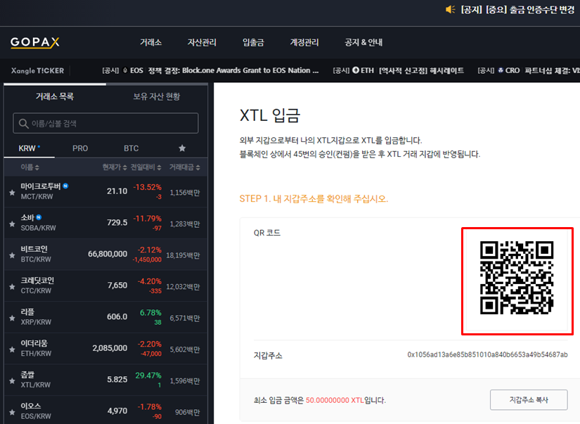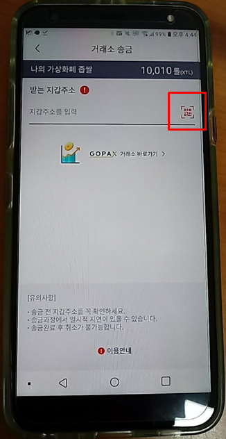 다시 머니트리 어플을 킵니다. 아까전에 거래소 송금 화면을 들어가면 아래의 화면이 나오는데 거기에 우측에 있는 빨간 QR코드 그림을 터치 합니다. 그러고 PC 화면의 QR 코드를 갖다대면 좁쌀머니가 고팍스 계정으로 옮겨가게 됩니다. 대신 거래소 처리 시간이 약 1~2분 소요됩니다. 약간만 고팍스 홈페이지에서 기다리세요.