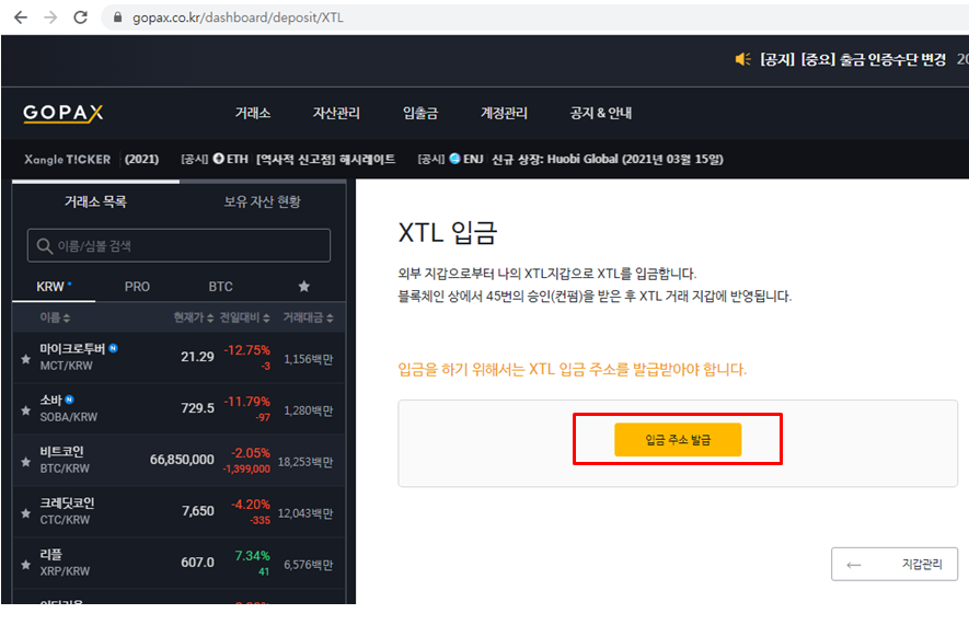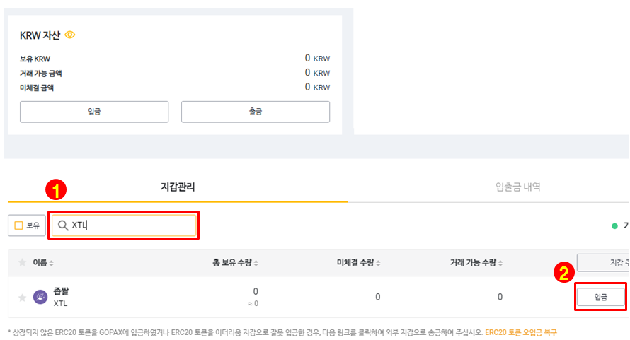 지갑관리에서 "XTL"을 검색하세요. 그런 다음 입금 버튼을 클릭하세요