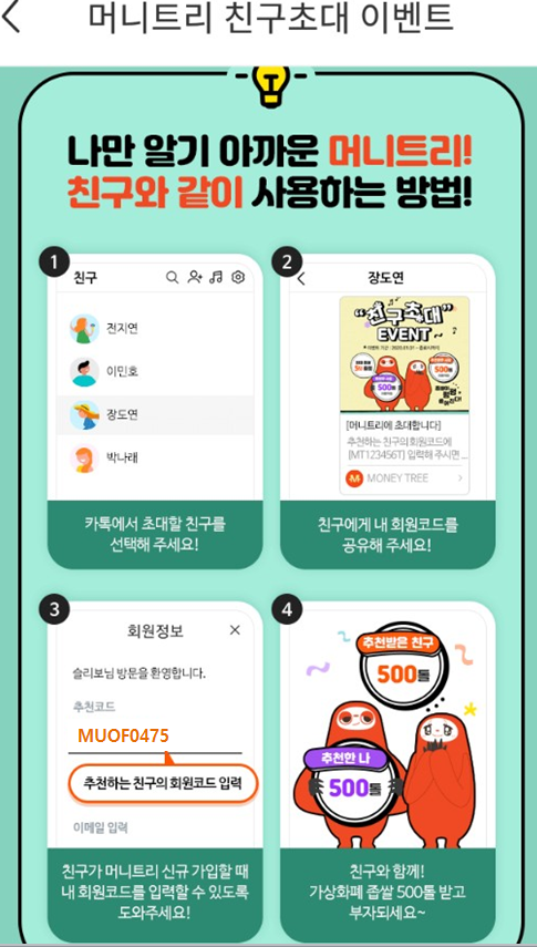 우선 머니트리에 가입해야 합니다. 머니트리는 플레이스토어에서 머니트리를 검색하면 바로 찾을 수 있으며, 휴대폰에 설치하면 됩니다. 현재 머니트리 친구초대로 가입 시추천인/피추천인 모두 좁쌀 머니 (XTL) 가상화폐 500톨을 주며 (1톨당 6원이니, 3천원 혜택), 신규 가입이라면 추천인 코드를 입력하는게 좋습니다. 참고적으로 저의 머니트리 추천인 코드는 MUOF0475 입니다.