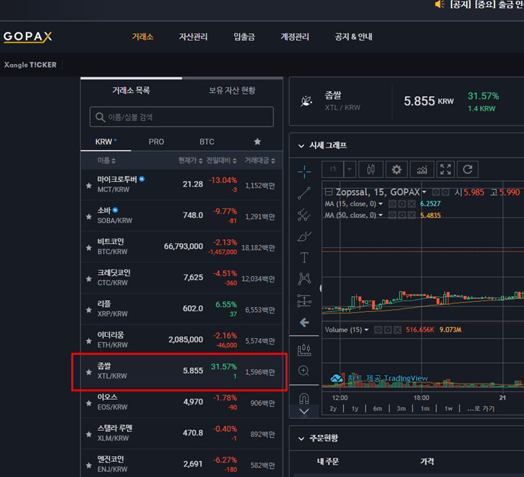 좁쌀 매도하는 건 어렵지 않습니다. 거래소 목록에 XTL을 검색하시거나, 중앙부분에 좁쌀이 나오네요. 그걸 클릭하세요.