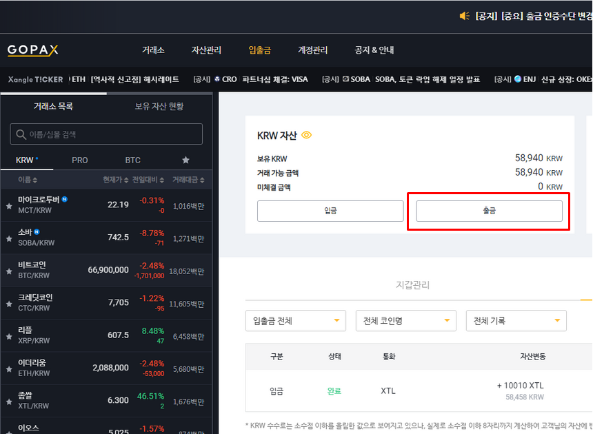 거기에서 머니트리 캐시를 옆으로 밀면 좁쌀머니 XTL 이 나옵니다. 10,010톨이 있네요. 원래는 60만원을 교환했으니 6천톨이어야 맞는데, 4천톨은 이전에 있던 좁쌀이 있어서 만톨 정도가 있네요. 여기에서 거래소 송금을 해야 하는데, 그러려면 고팍스에 가입이 되어야 합니다. 머니트리에서 작업은 일단 여기서 멈춥니다.