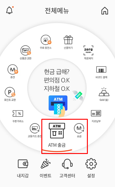 * 편의점 ATM 출금방법도 있는데 한도는 30만원 별도이며, GS25 ATM기기 이용 시, ATM화면 우측 하단에 머니트리 버튼을 누르시면 수수료 5%를 제하고 출금 가능합니다. (방법 : 머니트리 전체메뉴에서 'ATM 출금' 버튼을 누름 / 아래 이미지 참조)
