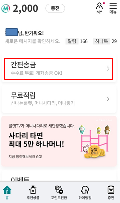 충전을 하셨으면, 송금을 하기 위해 다시 메인화면으로 돌아와서 간편송금을 터치합시다.