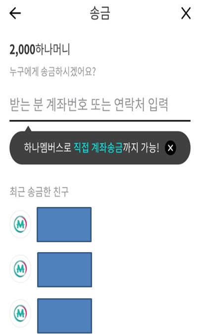 상기의 화면에서 전화번호를 입력하여 하나머니를 선물할 수 있습니다.
