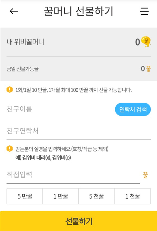 그러면 선물하기 세부 화면에서 친구 이름과 연락처를 입력하고, 선물하고 싶은 금액을 입력합니다. (1일/1회 10만꿀, 월간 최대한도 100만원) 그리고 선물하기 버튼을 터치하면 선물하기가 끝납니다.
