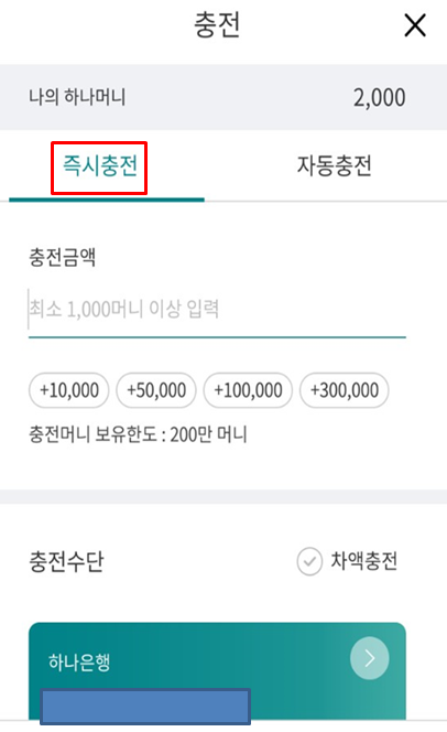그러면 아래의 화면이 나오는데, 좌측의 즉시충전을 터치하고, 원하는 금액을 입력합니다.