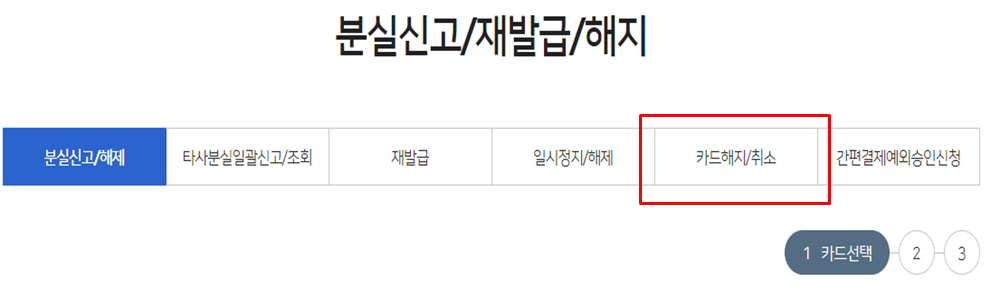 빨간색 박스에 있는 내카드 관리에서 해지를 클릭해서 들어가세요. 그러면, 5번째 탭의 카드해지/취소 탭으로 진입하세요.