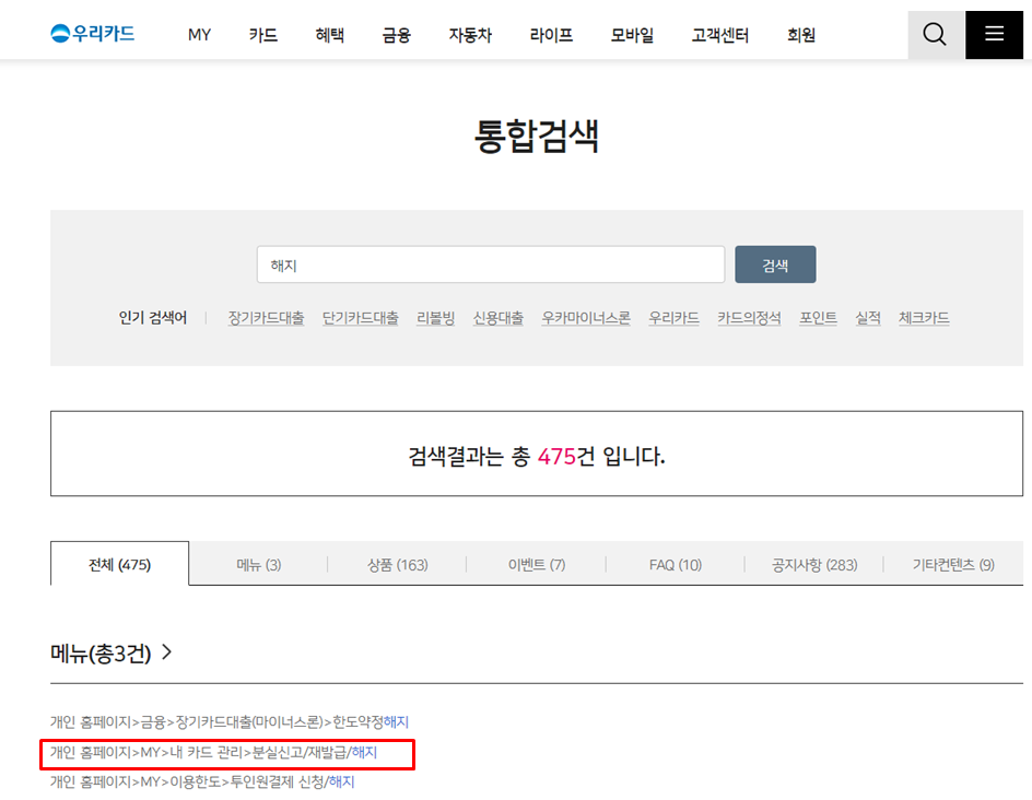 바로 전화를 끊고 우리카드 홈페이지에 접속하였습니다.