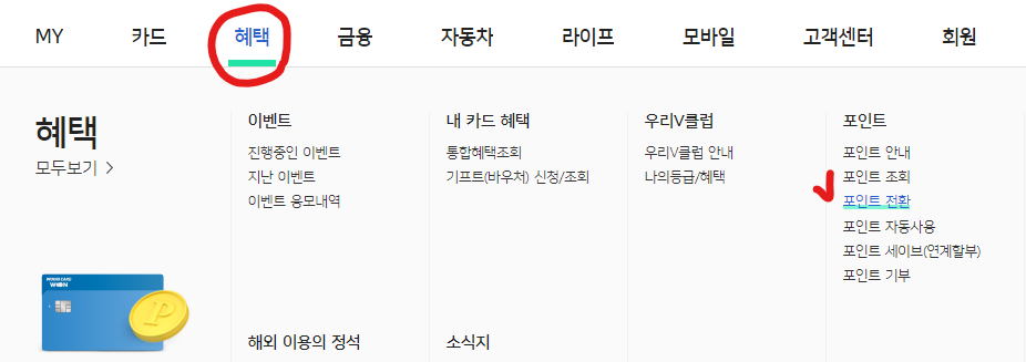 혜택 탭으로 이동 → 포인트 전환을 누릅니다.