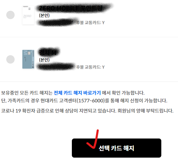 해지할 카드를 선택 후 " 선택 카드 해지 " 버튼을 클릭하게 되면 카드해지가 됩니다.