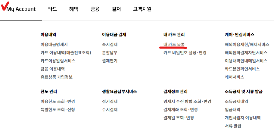 그래서 현대카드 홈페이지에서 카드 해지 방법을 알아봤습니다. 우선 현대카드 홈페이지에 접속 합니다. My Account → 내카드관리 → 내카드목록으로 진입합니다.