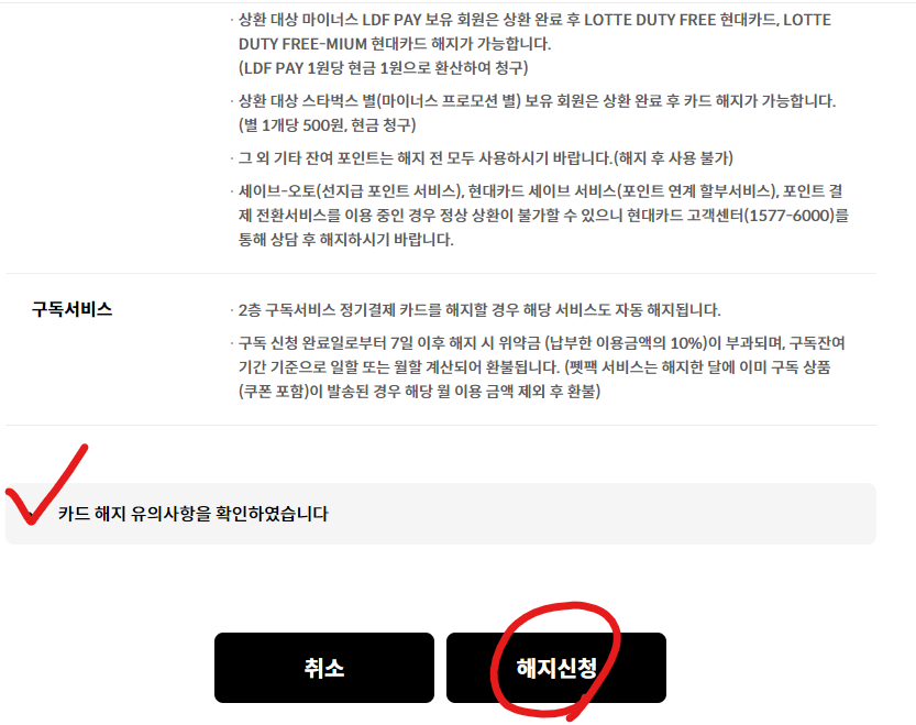 카드 해지 유의사항을 확인란에 체크 후, 해지 신청 버튼을 누릅니다.
