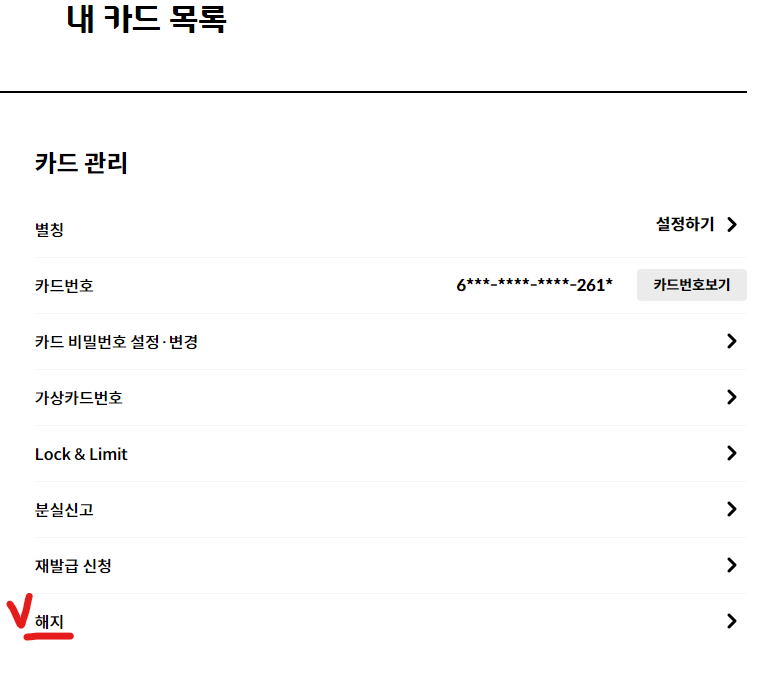 해지를 원하는 카드를 선택 후, 아래의 그림처럼 카드관리 하단의 해지를 클릭합니다.