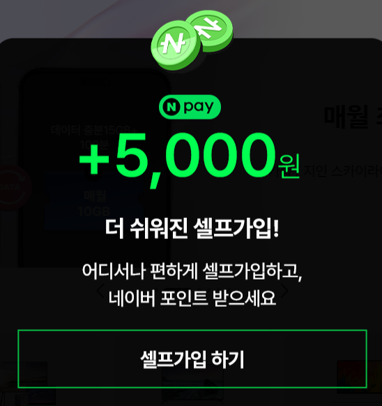 현재 프로모션으로 최초 셀프개통 회선에 대해 네이버페이 5천원권을 주는 행사를 진행하고 있는데, 본 포스팅을 늦게 봐서 해당 프로모션이 없어지더라도 본 요금제는 회선유지용 혹은 소액결제용으로도 충분히 활용할 만한 요금제입니다.