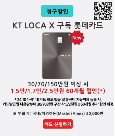 | kt 통신요금 할인카드 추천 1탄 (kt BC 바로 SUPER 카드, kt DC Plus 카드, kt 가족만족 DC 신한카드) (3) | 2024.10.06 |